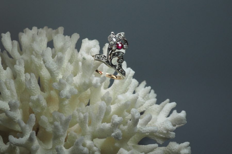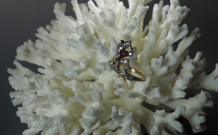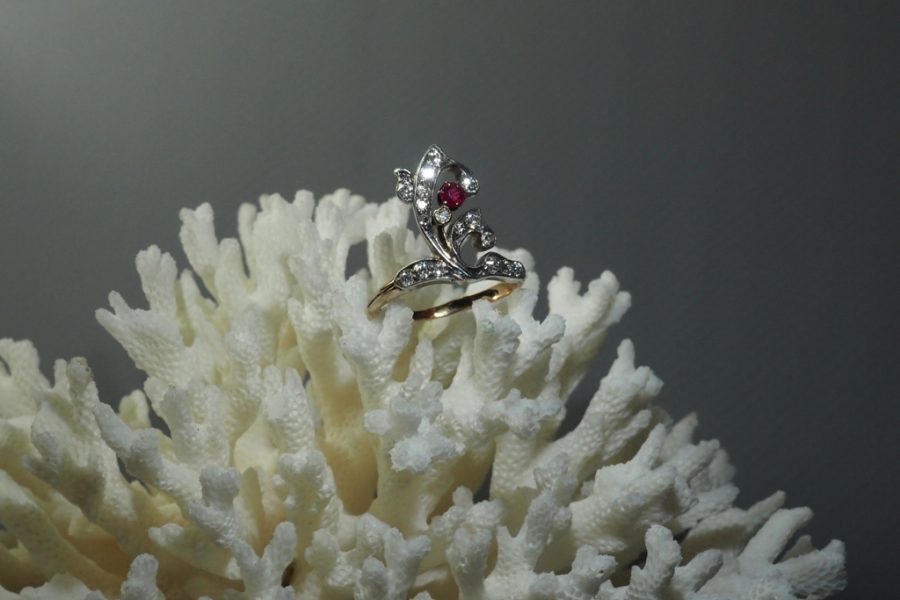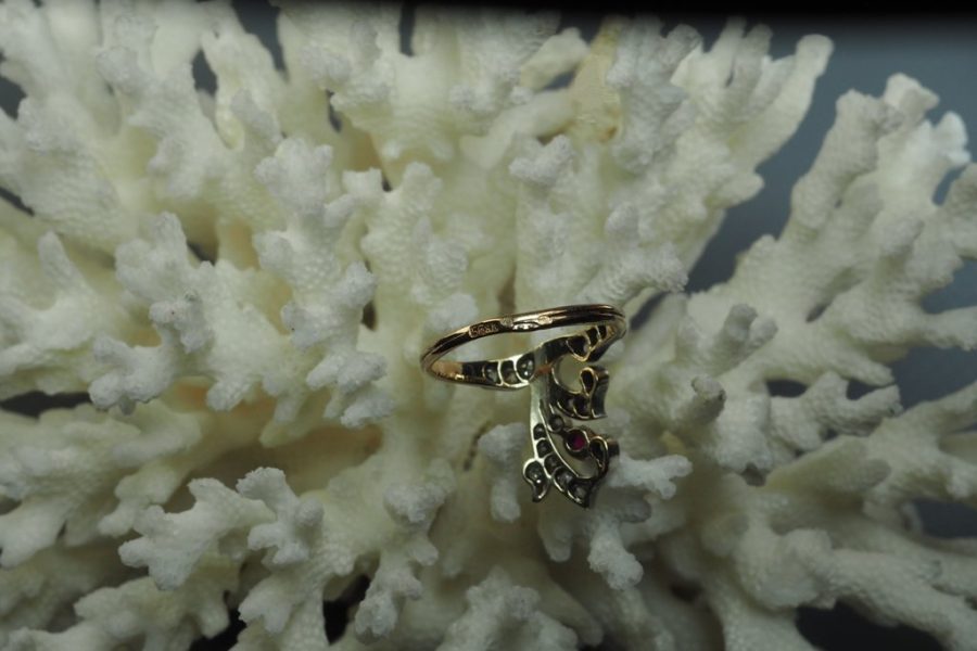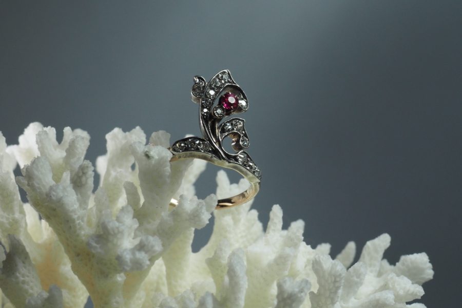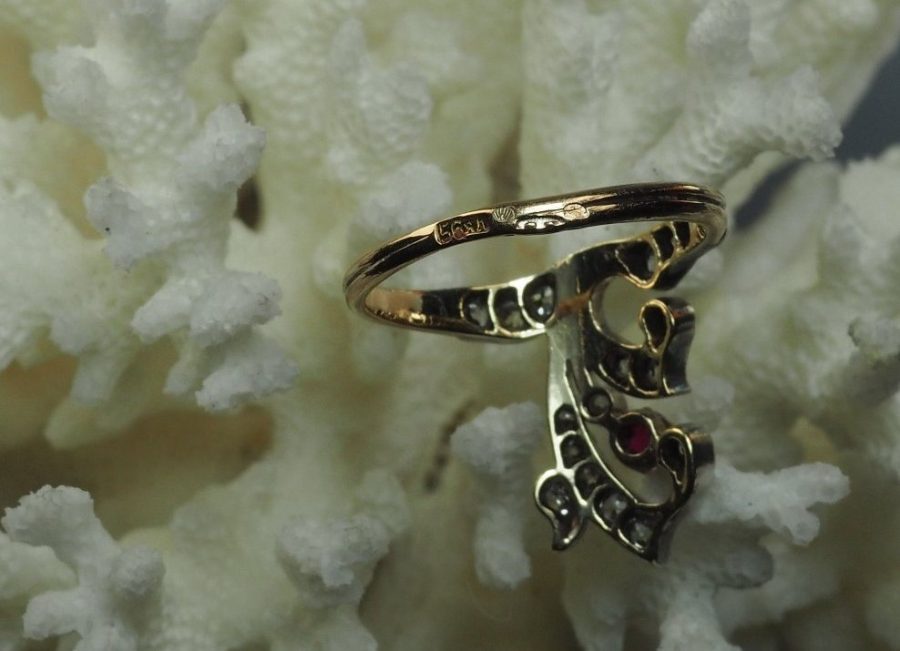 Bague en Or (585) et argent (800) sertie de diamants taille vintage « rose » et rubis taille vintage. Trois inscriptions (dont « 56 YAL », « coquille » avec lettre A).