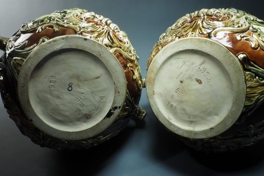 Au revers de chaque vase figure une marque imprimée «BW», accompagnée du numéro de moule « 1952 » et du chiffre « 8 ». Selon les recherches, l’abréviation « BW » pourrait correspondre à un code de fonderie interne – Bodenbach Werkstatt («atelier de Bodenbach»), utilisé pour identifier l’atelier ou le service de moulage. Si ces vases faisaient partie d’une série de production plus large, le numéro 1952 désignerait très probablement la forme du moule, tandis que le chiffre « 8 » indiquerait une variante de modèle ou de décor.